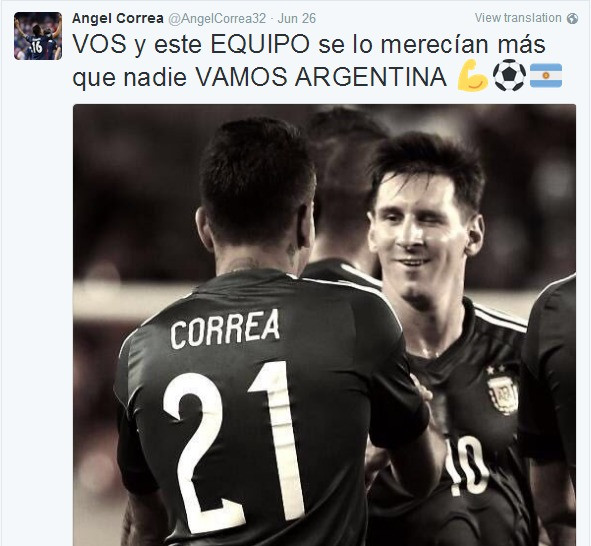 安赫尔-科雷亚(阿根廷球员,现效力于马竞):“你和这支球队比任何人都配得上冠军。#加油阿根廷!”