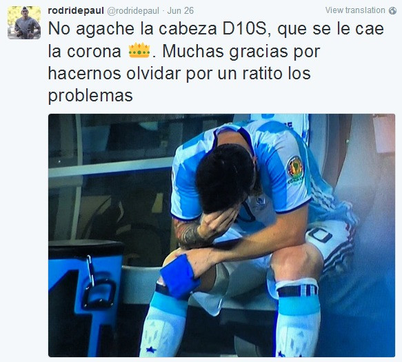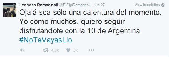 莱昂德罗-罗马诺利(阿根廷球员,现效力于圣洛伦索):“希望他只是说的气话,我像很多人一样,想继续欣赏你身披阿根廷10号球衣的日子。”