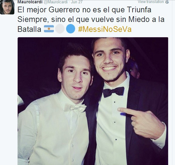伊卡尔迪(阿根廷球员,现效力于意甲国际米兰):“最好的战士不是那个一直获胜的人,而是毫无畏惧重回战役的那个。#梅西别走”