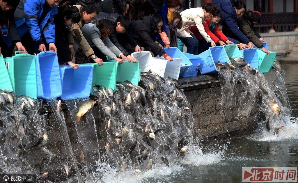 2016年02月22日,山东省济南市,众多市民来到大明湖南岸,以每斤4.5元的价格购买鲤鱼和鲫鱼,集体将鱼儿放生到大明湖,千余尾鱼儿同时倾倒在湖中,场面颇为壮观。