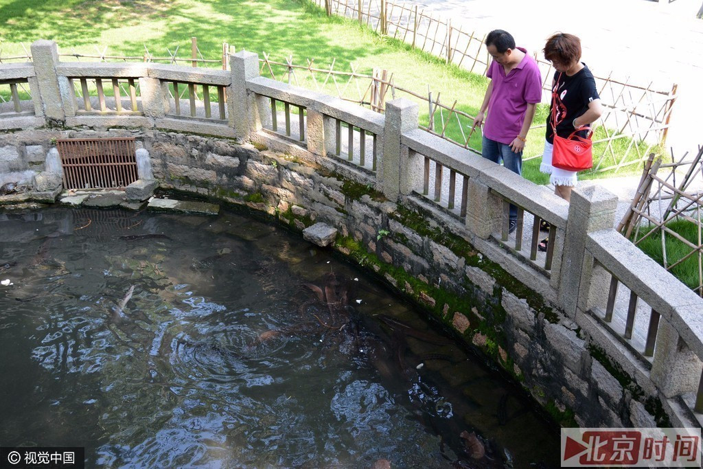2016年06月07日,福建省厦门市,南普陀寺天王殿两边的水池里,乌龟和鲶鱼众多,密集如“下饺子”,争抢食物。