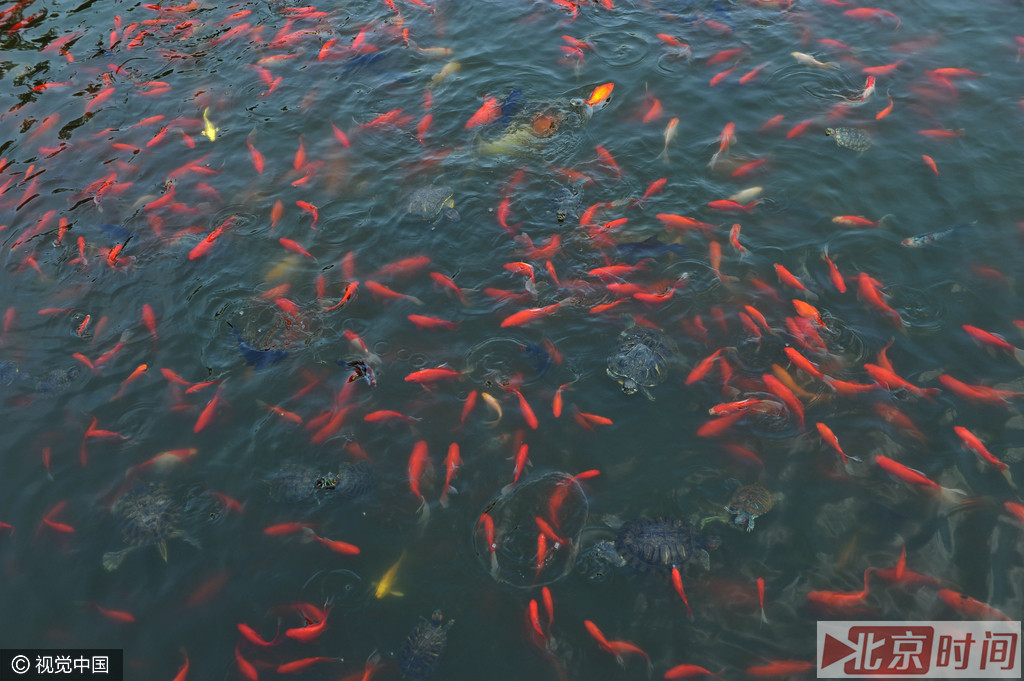 2016年6月17日,青岛湛山寺放生池,密集的鱼和乌龟争夺生存空间。据了解,湛山寺管理方面早已立牌提示,放生水域有限,敬请另选别处字样,但不少市民以放生祈福为由偷偷放入活鱼、乌龟、牛蛙等生物在池中,致使狭小的空间内“拥挤不堪”,甚至“相互蚕食”,失去了放生的意义。