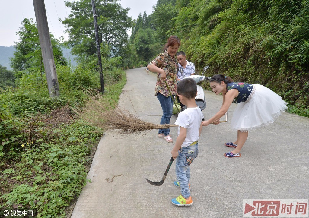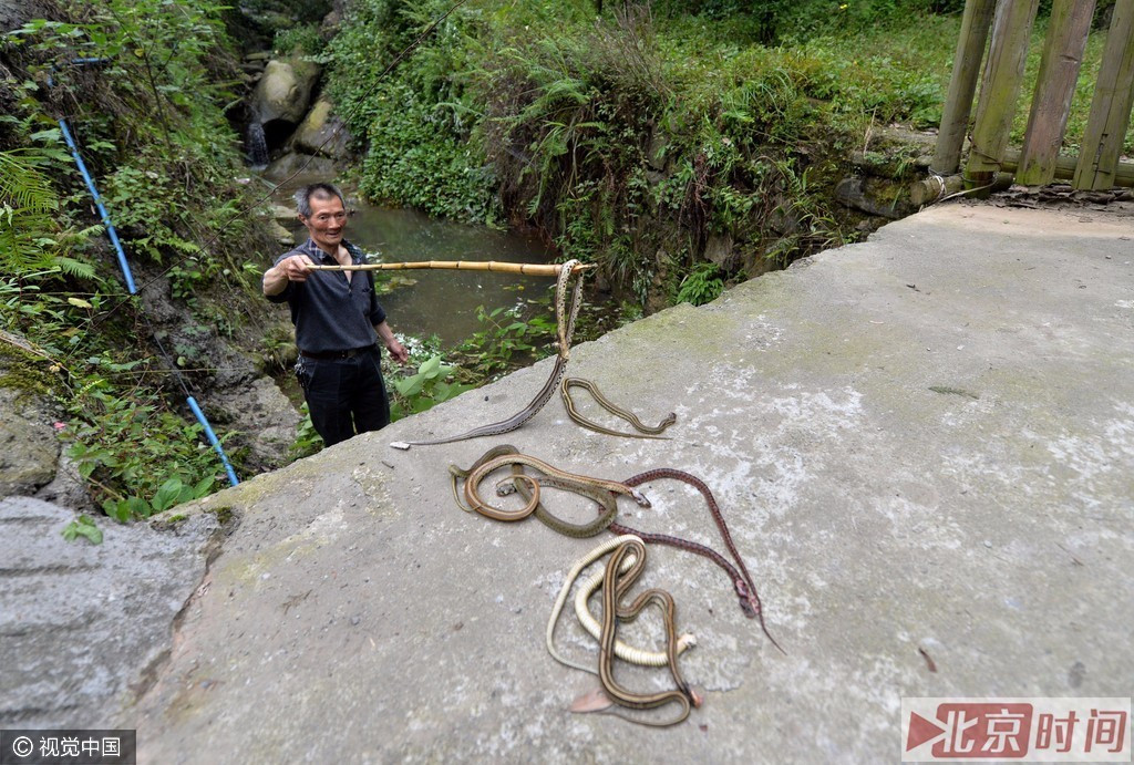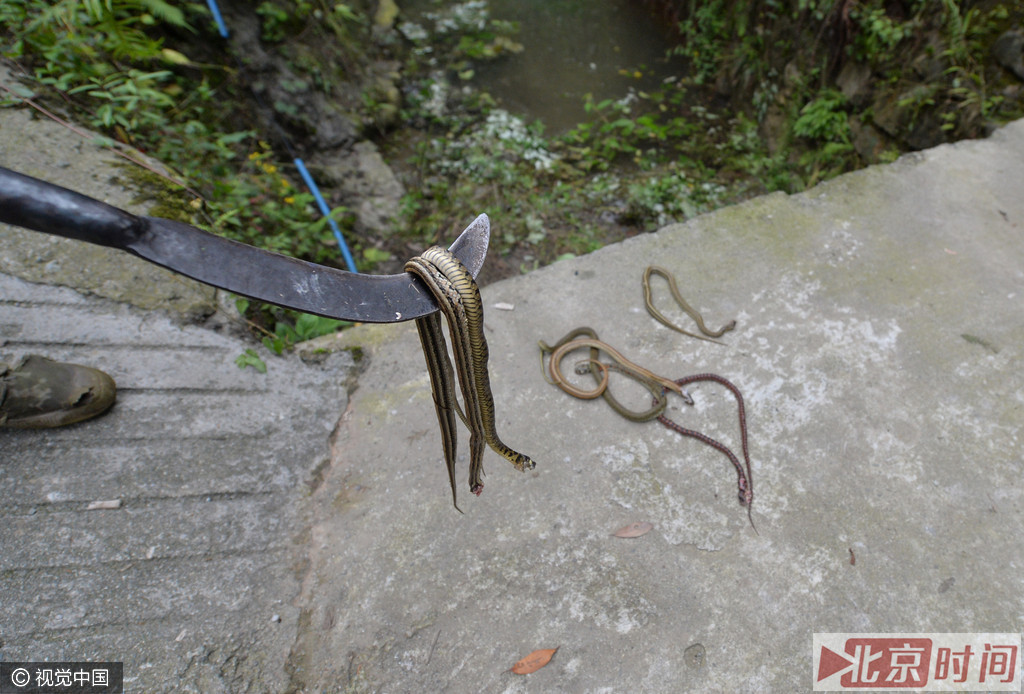 自从村里出现蛇以后,每天过了晌午,董全丽都会和另外几名村民拿着木棍、镰刀等工具出门,沿着山路打蛇。这些被放生的蛇,除了菜花蛇等无毒蛇类,还有虎斑颈槽蛇、红点锦蛇等毒蛇。为保安全,村民自发组织对这些跑到马路上和钻进民房的小蛇进行捕杀,一场“放生”演变成了“杀生”。