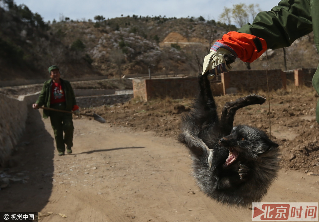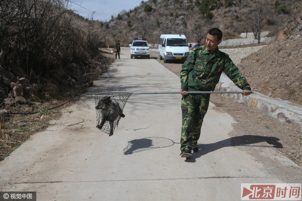 2016年4月9日,怀柔汤河口镇汤河口村,负责调查此事的森林公安称,确实有人在汤河口村附近放生狐狸,但该行为并没有经过森林公安许可。图为森林公安捕获被放生狐狸。