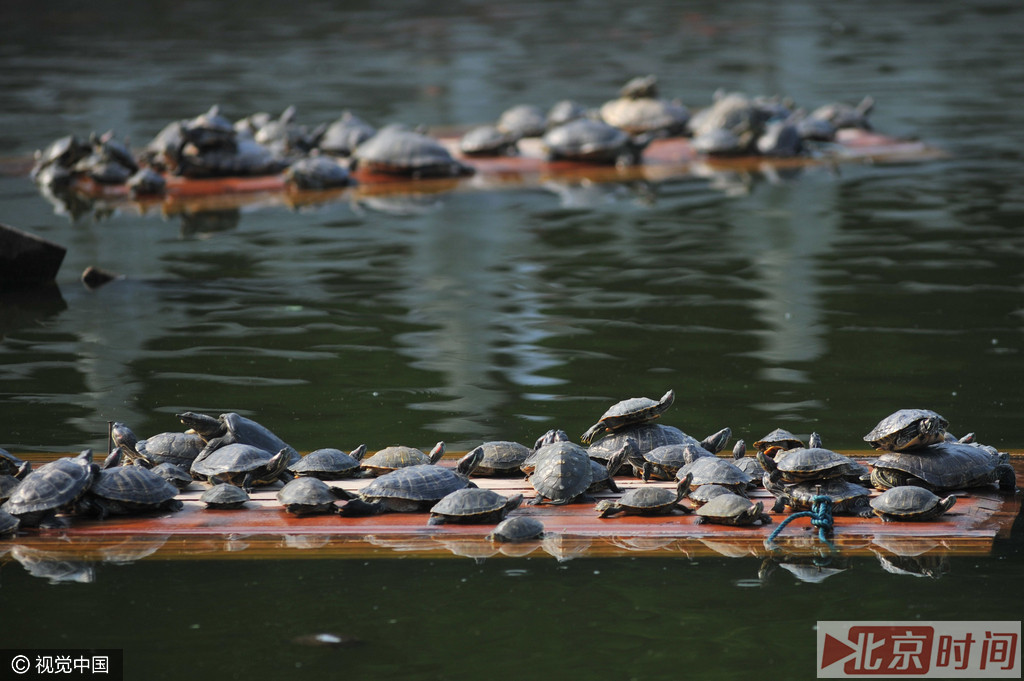2016年6月17日,青岛湛山寺放生池,由于放生的乌龟密度过大,空间狭小,放生池内的乌龟爬到木板上晒太阳,甚至叠起了罗汉。
