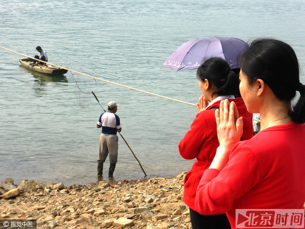 2016年3月6日,广西梧州市西江岸边,右边是参加行善放生鱼类的市民,左边的“渔民”将刚刚放生的大鱼用鱼兜重新抓起来。