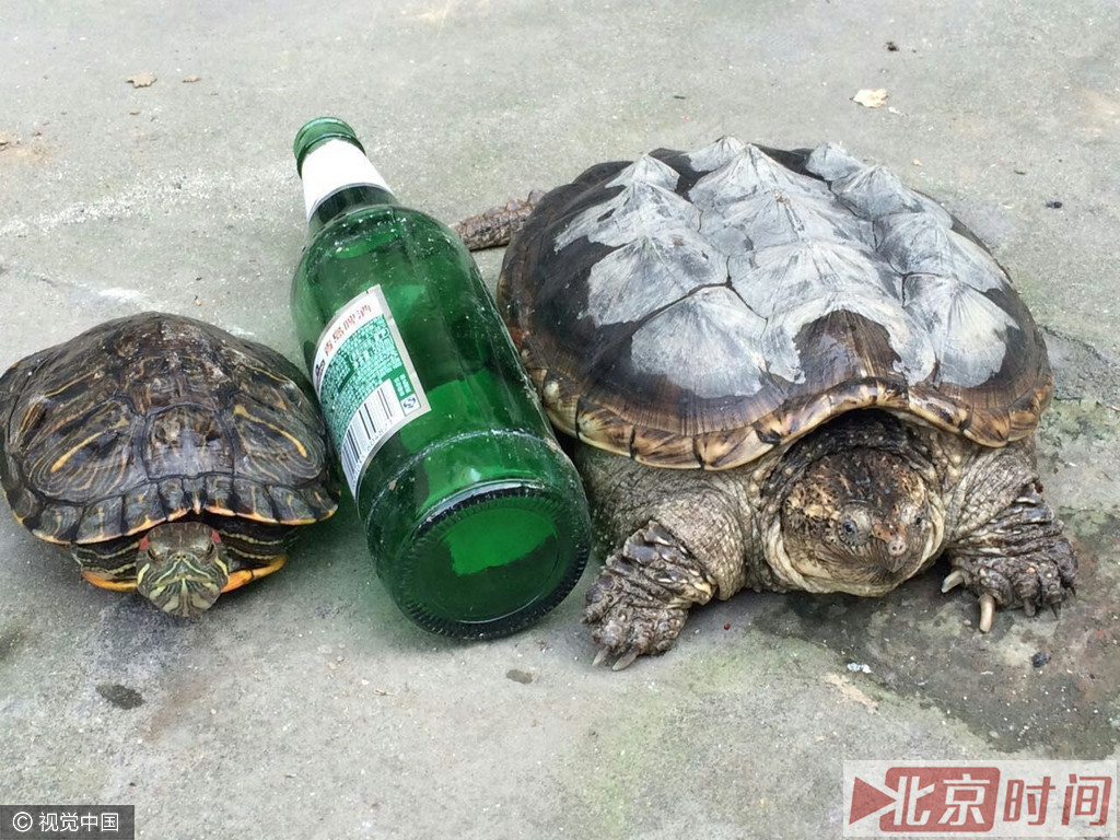 2016年4月20日,陕西安康一市民在汉江边散步时,捕获一只长相凶猛的“怪龟”,后经专家鉴定,是一种名叫鳄龟的外来入侵物种。据专家介绍,由于这种龟性情凶猛,在汉江几乎没有天敌,提醒市民不要随意放生这种外来入侵物种,以免对当地生态环境造成破坏。图中右侧为鳄龟。