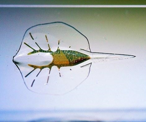 这只机器鱼内部大约有20万个的大老鼠肌肉细胞,工程师可以通过控制光脉冲信号来控制这条微小的机器鱼的游动方向以及速度,使得它能够像黄貂鱼一样在水中优雅地游来游去。