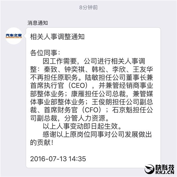内部信称,秦致、钟奕祺、韩松、李欣、王友华不再担任原职务。陆敏担任公司董事长兼首席执行(CEO),并监管经销商事业部整体业务;康雁担任公司总裁,监管媒体事业部整体业务;王俊朗担任公司副总裁、首席财务官(CFO);石京魁担任公司副总裁,分管人力资源