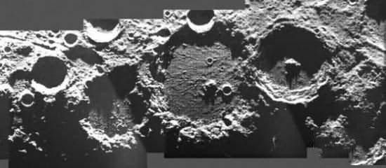 图中显示的就是三个紧密排列的撞击坑,由欧洲空间局SMART-1探测器上的成像装置拍摄,这张拼图的大小为220公里乘以700公里,位于月球的北极附近,从右至左,这三个撞击坑被命名为Plaskett、Rozhdestvenskiy以及Hermite撞击坑。