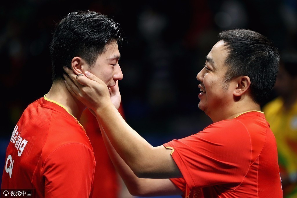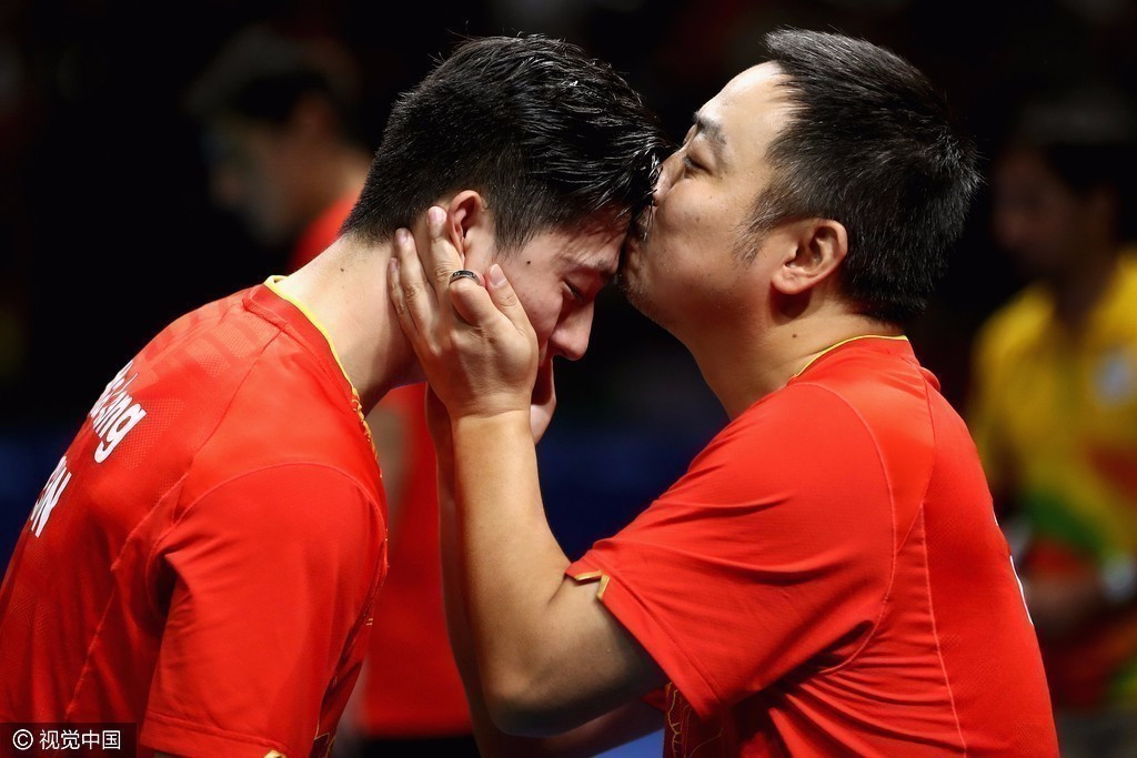 刘国梁亲吻了马龙的额头。