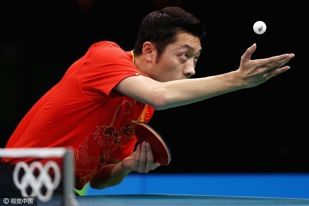 第二场,许昕迎战日本第一单打水谷隼。水谷隼以12-10先下一城。随后,水谷隼乘胜追击,11-9再赢一局。第三局,背水一战的许昕11-3赢下一局。随后,许昕11-7再扳回一局。决胜局,许昕在10-7拿到三个场点的情况下,被水谷隼逆转10-12告负,最终水谷隼3-2战胜许昕,为日本队扳平比分。图为许昕发球。国乒团体丢里约奥运第一分 日本一哥扔拍庆祝>>