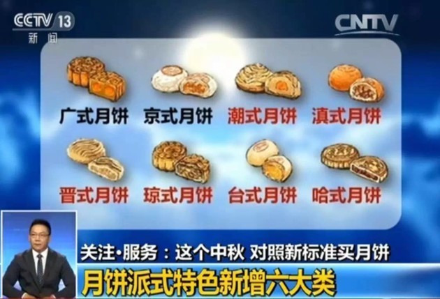 新国标里不仅给月饼”验明正身",还不忘让不同地域的月饼从此"当家做主"。此次新国标中,特意将此前“按地方风味特色”明确为“按派式特色分类”,除了我们熟知的传统广式、京式月饼等,还新增了“潮式月饼”、“滇式月饼”、“晋式月饼”、“琼式”、“台式”和“哈式月饼”六种分类,就是以潮州、云南、山西、海南、台湾、哈尔滨地区制作工艺和风味特色为代表的月饼。