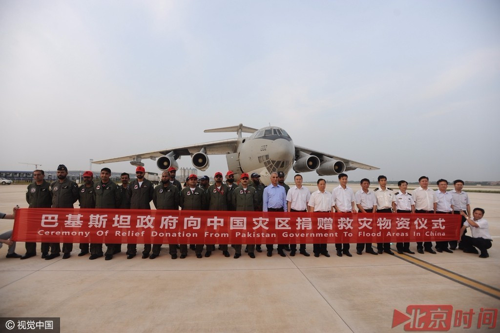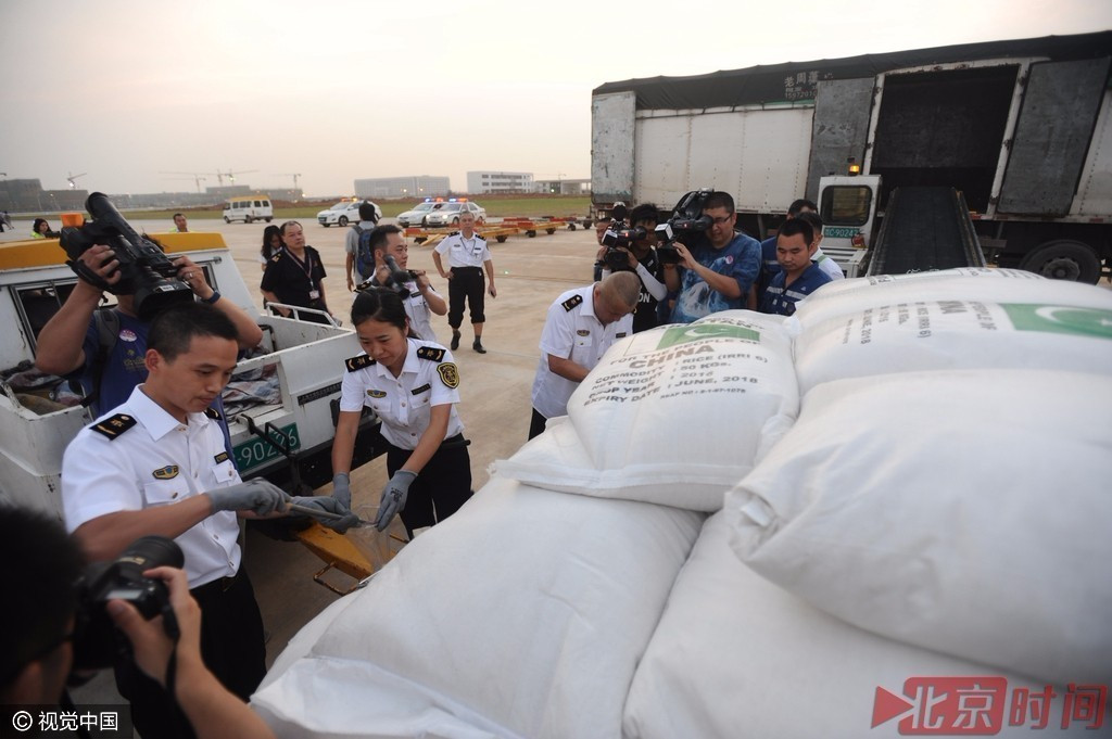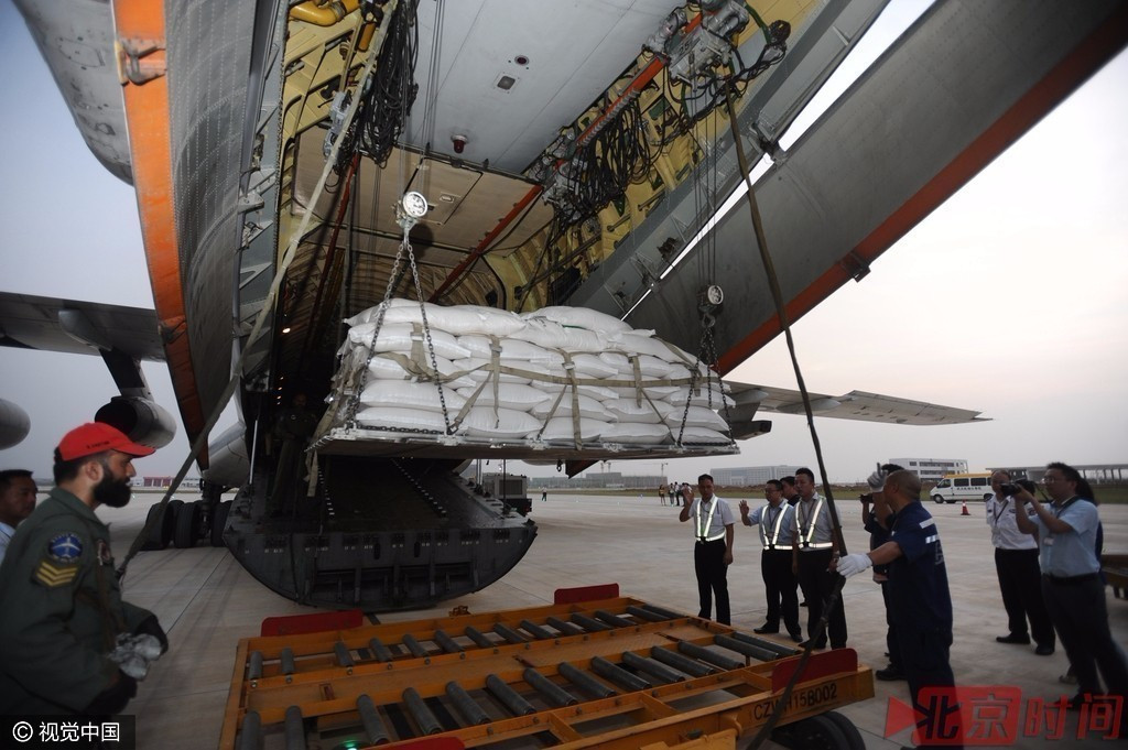 8月22日,武汉,一架巴基斯坦军用运输机降落在天河机场,机上满载着巴基斯坦政府捐献给湖北省灾区的首批22吨大米,检验检疫部门现场抽检。漠风/视觉中国