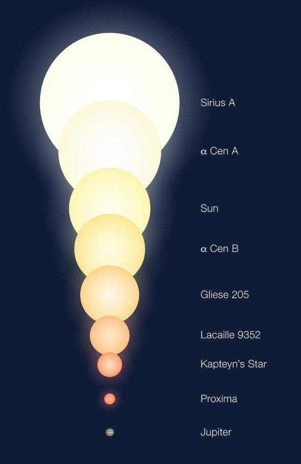 不同天体的大小对比,其中包括半人马座α三星系统中的三个成员(包括半人马座αAB双星系统中的两个成员恒星以及比邻星)。其中Sun是太阳,Jupiter是木星,图的最上方是天狼星,倒数第二个是比邻星