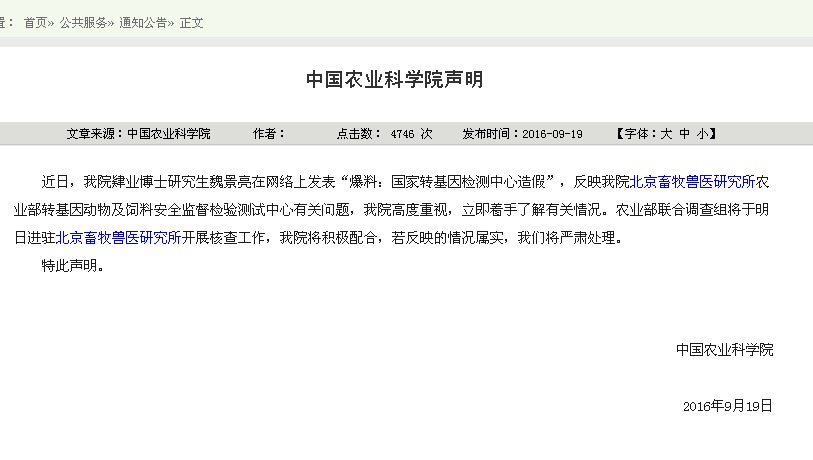 9月19日,中国农业科学院发布声明称,农业部联合调查组将进驻北京畜牧兽医研究所开展核查。