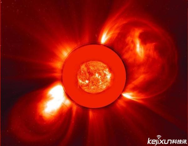 上图是太阳和太阳风层探测器在2000年拍摄的日冕物质抛射(CMEs)情景,图中,太阳向对称、相反的方向抛射物质。