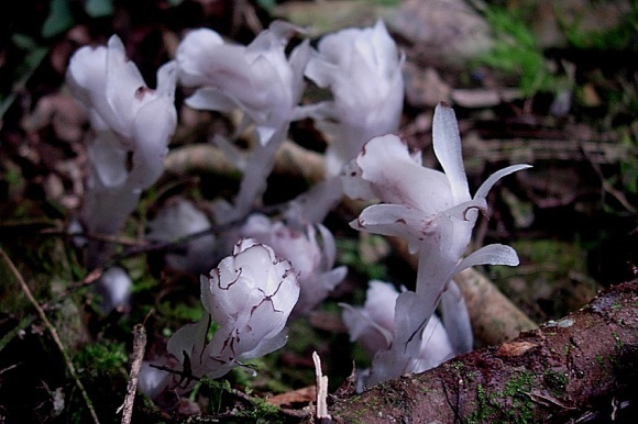 在自然界里,水晶兰并非难得一见的“幽灵”,只要知道它的习性,寻找水晶兰也并非难事。首先需要找到它寄主的生存环境。水晶兰喜欢的寄主一般是那种既能腐生又能寄生的菌类,例如花盖菇、绿菇等。这些真菌一般比较喜欢油松树等针叶树,这就是为什么高山上茂密的松树林中常能见到水晶兰的原因了。