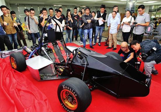 学生们自主研制的方程式赛车亮相 本报记者 马昭 摄