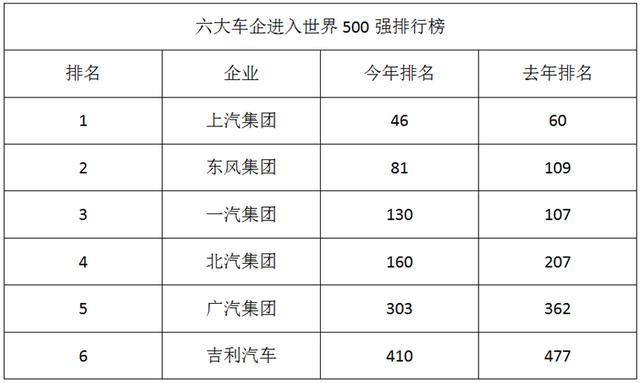 上汽集团(排名46位)、东风集团(排名81位)、一汽集团(排名130位)、北汽集团(排名160位)、广汽集团(排名303位)、吉利汽车(排名410位)。