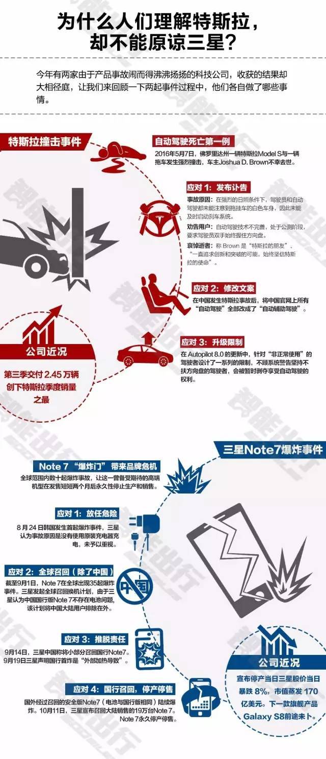 这两件事成为了这个季节下的热点。虽然特斯拉和三星是完全不同的两家公司--产品、思路、商业基因都无从比较,但今年都因为“产品引发安全事故”遭遇危机。在事件发酵、早期的时候消费者对两起事件的态度出奇的一致--质疑、担心等等,但最终结果两者却大相径庭。