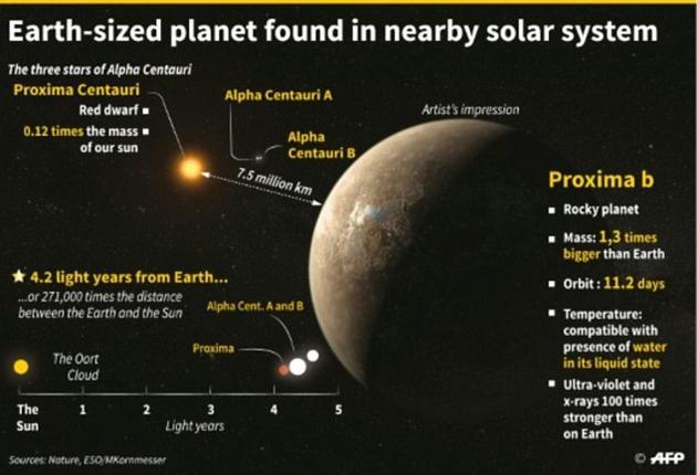 今年8月,科学家宣布发现了比邻星B。它所围绕的中央恒星是该恒星系中最小的一颗。该行星上可能存在海洋,甚至可能有适宜生命存活的自然条件。它处于半人马座比邻星的宜居带中,到地球的距离约为4光年。据估计,它的质量约为地球的1.3倍,距中央恒星约750万公里,大约是水星到太阳距离的十分之一。