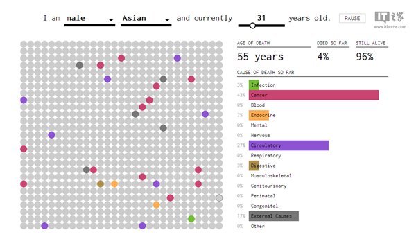 用户仅需输入自己的性别、肤色和当前年龄,这个图形模拟器上就会显示出一个个代表你的生命的小圆点,随着年龄增长,小圆点将渐渐变色,不同颜色代表不同的死亡方式。