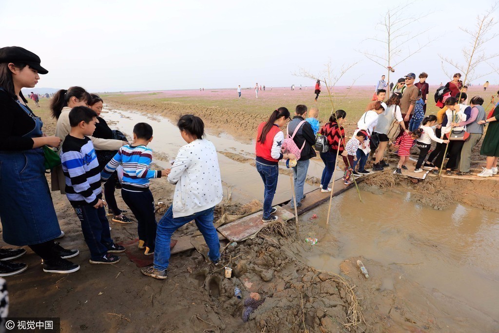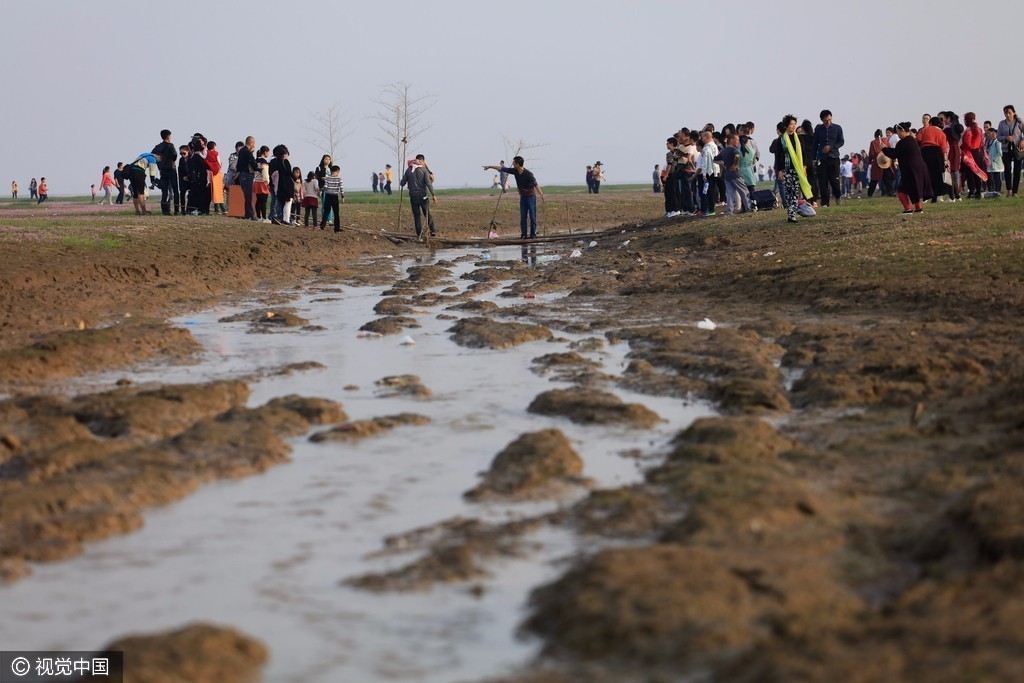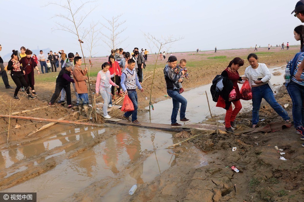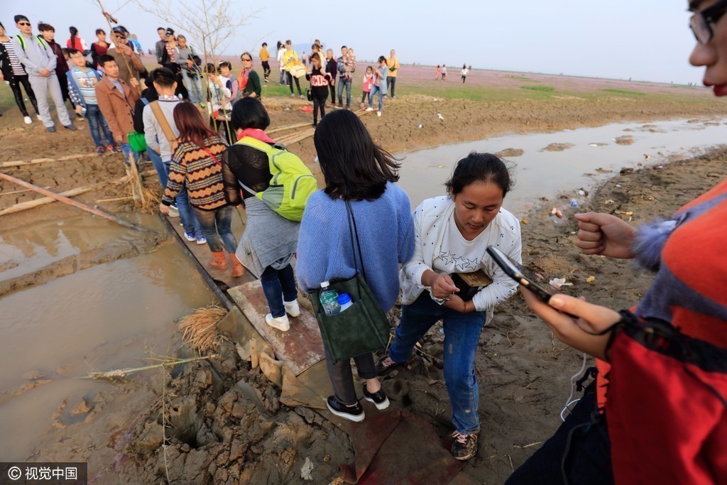 2016年11月6日,中国最大淡水湖鄱阳湖提前进入枯水位,形成了上万亩的鄱阳湖“蓼子花海”和“大草原”景观,一年一度的鄱阳湖草原、花海迎来“最佳观赏期”。附近的居民搭建了临时的小桥,供游客穿过小河,前往“蓼子花海”。在现场看到,大量的游客排队交钱过桥。