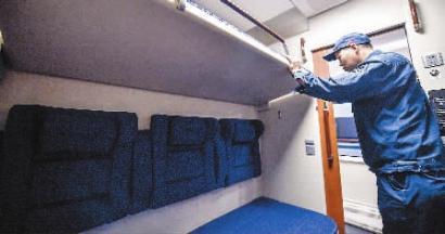 包厢里面,在白天的时候,上铺的床板不是平铺的,有60度的斜角。毕凯解释说,这样能保证在座位状态下,上铺有空间放置被褥、枕头,也不会给坐在下铺位置的乘客压迫感。