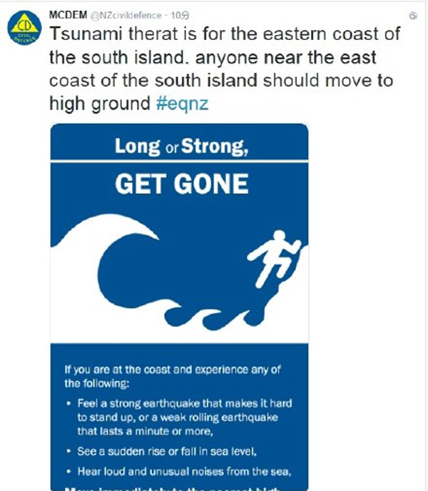 图为新西兰民防局发出了海啸预警,敦促南岛的居民移往高处。