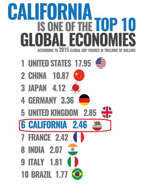 单独算的话,加州的GDP仅次于英国、略多于法国,是全球第六大经济体。