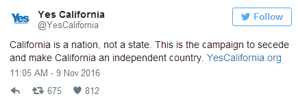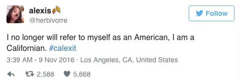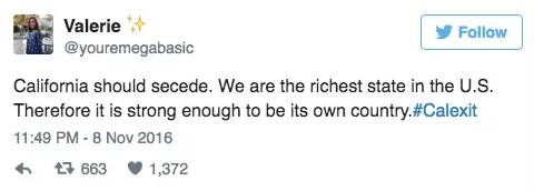其实早在英国脱欧公投后,要求加州脱美的呼声就已存在,甚至效仿Brexit(英国脱欧公投运动的英文简写)做了个Calexit的标签。