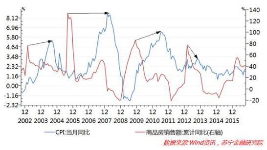 历史数据似乎也能找到一些佐证,如2005年8月在 “国八条”、“新国八条”、“国六条”和“十五条”连续出台后,房地产销售额增长率才掉头向下,半年后的2006年3月通胀周期开始启动,并于2008年2月达到高点(8.7%),在此期间,大量社会资金涌向猪肉市场,使得2007年8月猪肉价格同比涨幅达到80.9%。2010-2011年CPI超过3%的第二个通胀周期,同样与2010年3月的房地产“限购令”导致房地产销售回落不无关系,大量社会资金冲向农产品市场,生姜、大蒜、绿豆、猪肉价格轮番上涨;2013年的通胀小周期(10月CPI涨幅为3.21%),同样与当年3月房地产调控“国五条”相关。