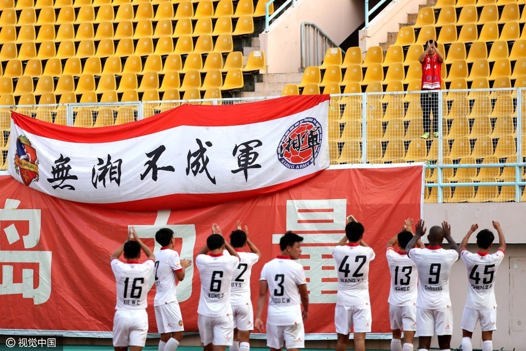 2016年9月25日,青岛天泰体育场,客队球迷区,一名高举球队围巾并打出条幅"无湘不成军"的球迷独自为他的球队、已经确定提前降级的湖南湘涛队加油。湘涛已经成立整整10年,2007年从乙级联赛开始打起,2010年开始作为湖南唯一的球队征战中甲联赛,一直苦苦支撑,直到今年告别。