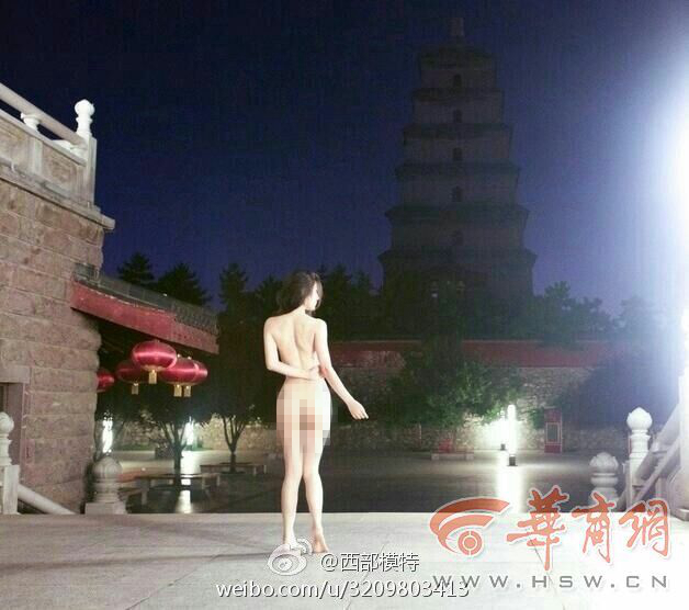12月21日晚,博主“西部模特”发出一张在大雁塔旁的女子裸体写真,微博中写道:“逆天啦,网传女孩凌晨在大雁塔附近拍人体写真。”