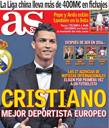 凭借在2016年度的杰出表现,C罗顺利拿到了欧洲年度最佳运动员的称号,这是他在本年度获得的又一个人荣誉,此前皇马球星已经拿到了金球奖、欧足联最佳球员、goal50年度最佳球员、《世界足球》最佳球员、世俱杯金球奖等一系列的个人荣誉,如今C罗继续收割着属于自己的荣誉。值得一提的是,C罗不仅是足坛第一位拿到这个奖项的球员,同时是葡萄牙历史上拿到这个奖项的第一人。