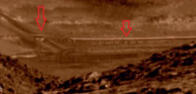 无独有偶,专家在下面这张从火星拍摄的照片中也发现了一些端倪。这张照片中很明显的一段横向建筑,如此笔直的建筑自然形成的几率很小很小。这与之前一些报道说在火星上看到人体雕塑有所不同,因为那些雕塑很可能是由于视觉偏差而导致的,而这种大型的建筑就很难说是视觉导致的了,因此这些建筑是人为修建出来的可能性很大。