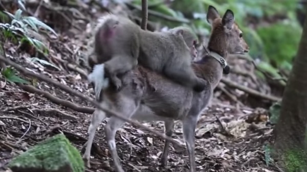 一只日本猕猴被拍到骑在一只雌性梅花鹿身上,并尝试与其交配。日本猿猴中心的研究者试图揭开这种奇特关系背后的秘密。"尽管我们知道日本猕猴会骑鹿,但这一个体明显表现出针对好几只雌鹿的性行为,其中一些鹿试图逃脱,另一些则接受了它,"研究者在近期发表的论文中写道。