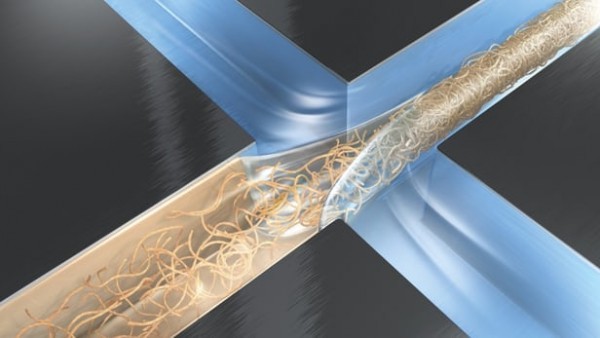 在Christofer Lendel博士和Fredrik Lundell博士的领导下,来自瑞典皇家理工学院 (KTH) 的研究人员在牛奶提炼的乳清溶液中加入了一种酸性物质,并获得了纳米纤维,其基本上是一种微小的蛋白质链。溶液中乳清蛋白的浓度越高,蛋白质链就越短和越细。在流体聚焦过程中,将含有纳米纤维的载液泵送到小管中。当水流从两侧垂直流入小管中后,纳米纤维被挤压在一起。随后,它们黏在一起形成了一种丝状纤维。