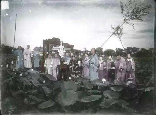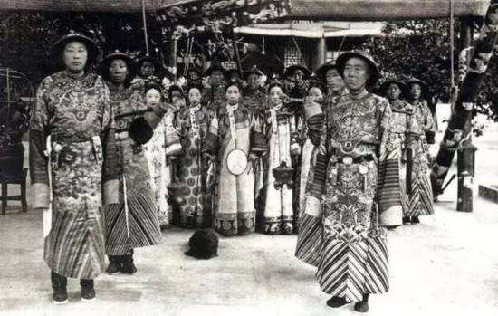 慈禧太后和后宫的嫔妃、以及太监、宫女合影。