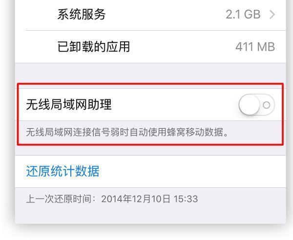叫:“无线局域网助理”也就是Wifi助理,如下图。这个功能意思就是说,当你连接的 Wi-Fi 信号较弱的情况下,手机会自动切换到蜂窝数据联网。