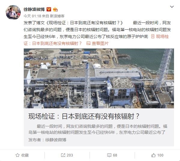 面对人们的谈核色变,微博注册显示为亚洲通讯社社长的媒体人徐静波近日就在日本对核辐射量来了一个现场验证。