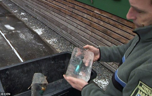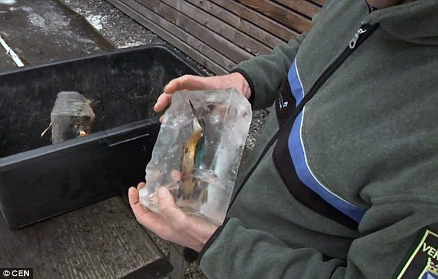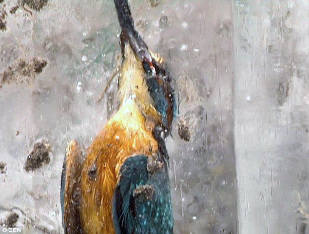 [分享]德国两只翠鸟入水抓鱼被冻在冰里