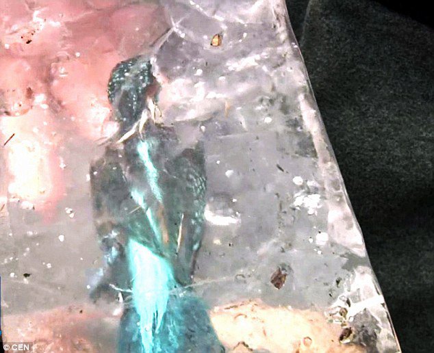 人为财死,鸟为食亡,这话一点都不假。据英国《每日邮报》报道,两只翠鸟钻入德国巴伐利亚州魏森多夫市的一条河里抓鱼,结果入水后没有找到出口,最终被冰封在厚厚的冰中。近日,这两只翠鸟被一个神父发现。