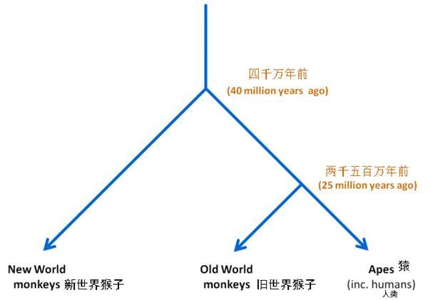 有点意想不到,人类和旧世界猴子比旧世界和新世界猴子有着更接近的共同祖先(就是说祖先之间的关系更近)。