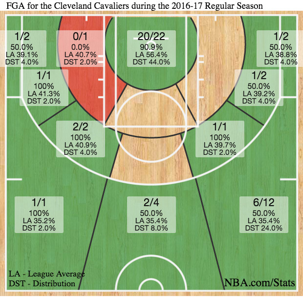 骑士的死亡五大重点攻击区域是篮下,他们在34分钟里有22次禁区出手,占了所有出手数的44%,他们命中了20球,投篮命中率达到90.9%,而联盟在这一区域的平均投篮命中率是56.1%。死亡五大也有出色的三分火力,他们21次三分出手,投进11球,三分命中率52.4%。