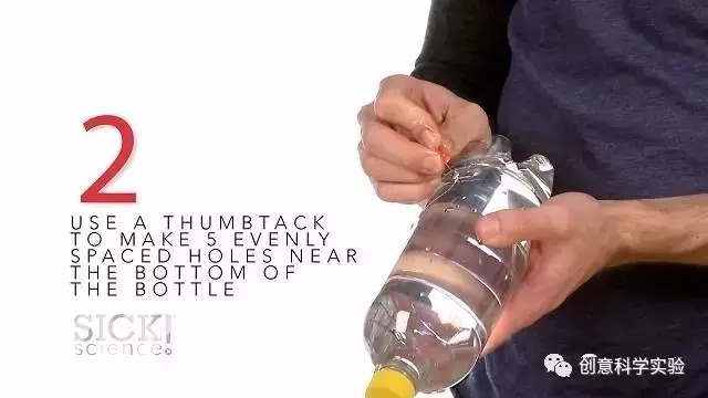 接下来拿出图钉,在瓶子下面横穿三、四个小孔,每个小孔大约相隔1厘米。