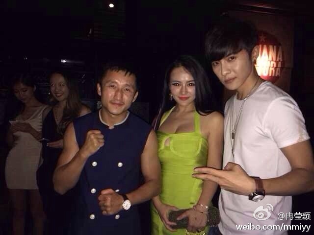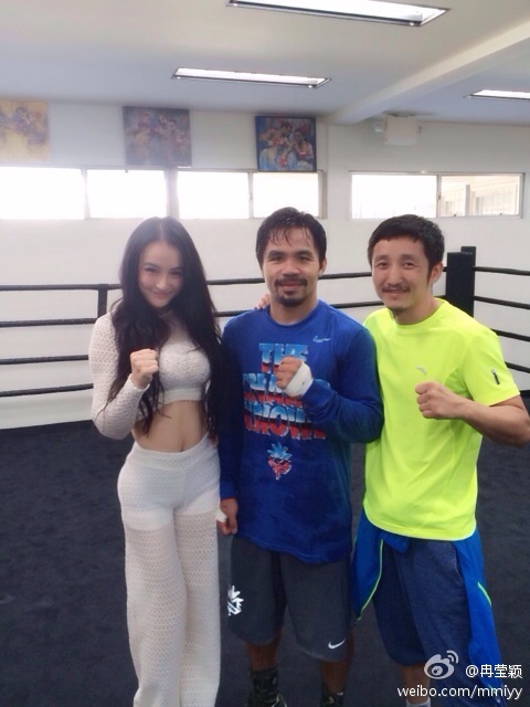 冉莹颖和老公还有帕奎奥的合影,冉莹颖这是在把内衣当外衣穿吗?
