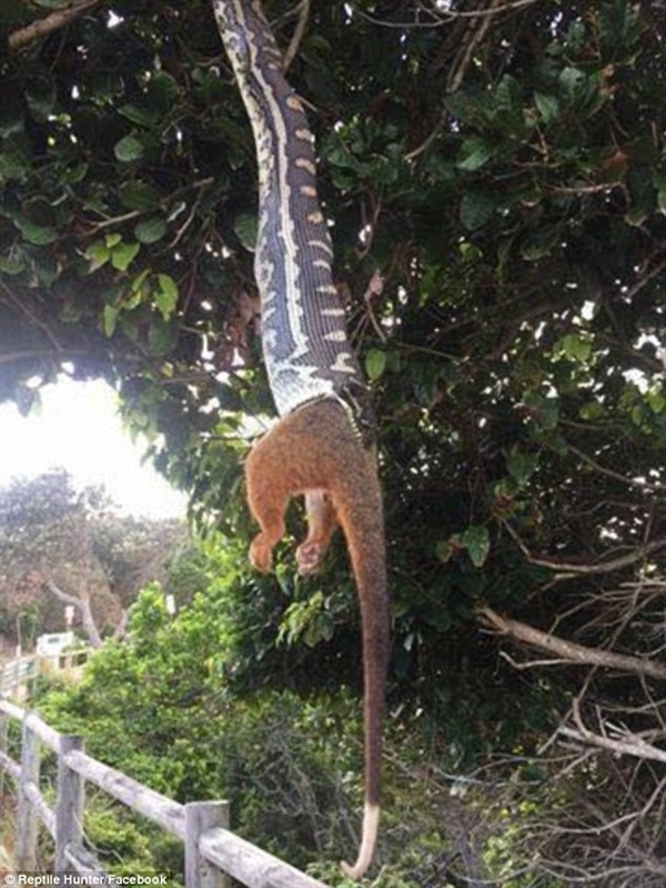 据《每日邮报》报道,日前,游客在澳大利亚拜伦湾的灯塔附近,目睹了令人毛骨悚然的一幕:一只1.4米长的地毯蟒倒挂树枝,生吞了一只硕大的负鼠。