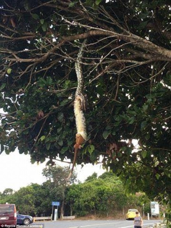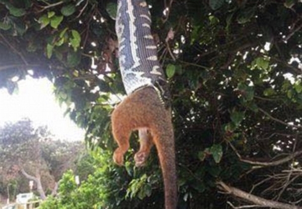 视频中,一只巨蟒尾部倒挂在树枝上,头部正在生吞着一只体型硕大的负鼠,当时那只负鼠的腿和尾巴还在不停的挣扎,这一幕瞬间引来路人纷纷围观。